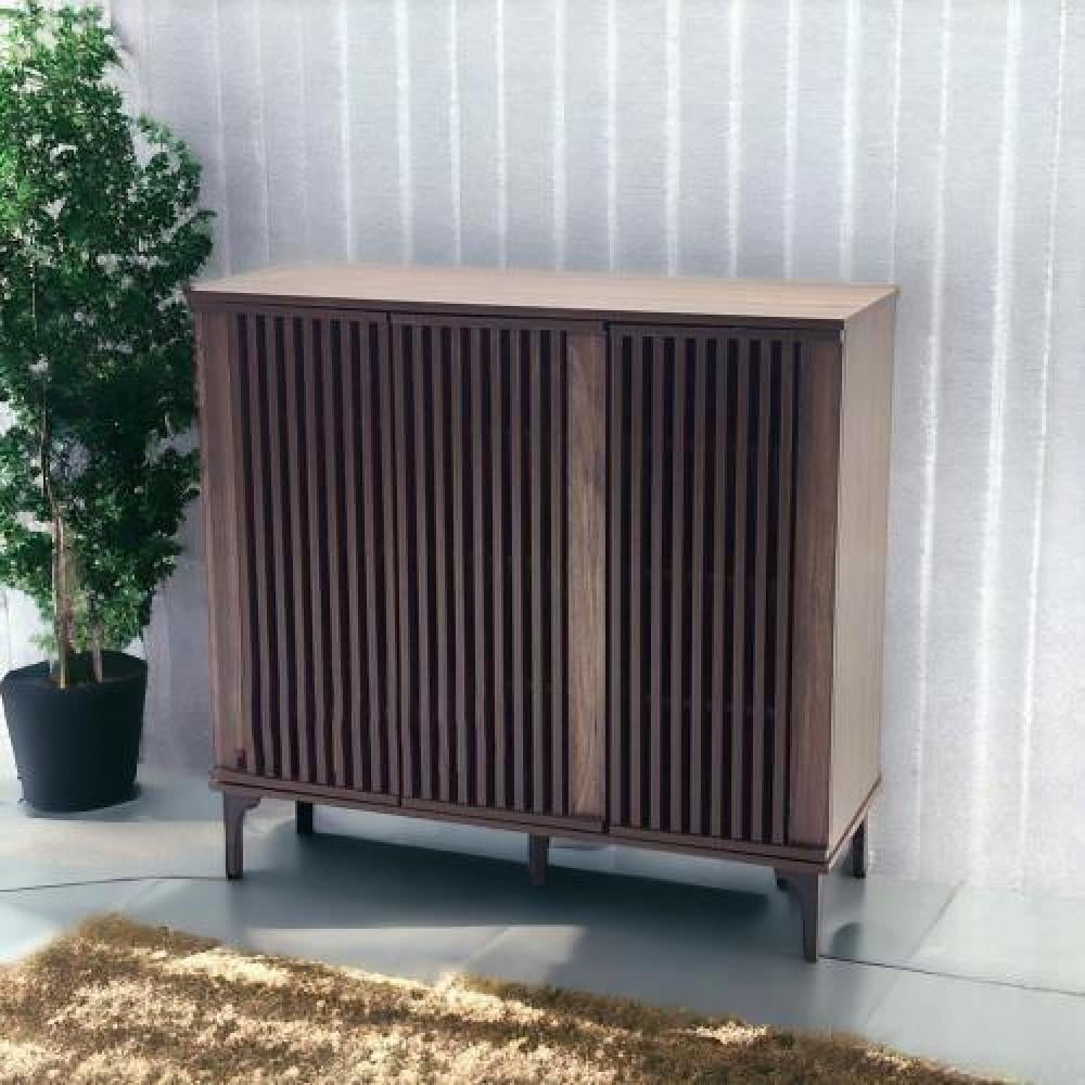 تتميز هذه الجزامة بتصميم عصري وعملي يضيف لمسة أنيقة إلى مدخل منزلك أو أي مساحة أخرى تحتاج إلى تنظيم الأحذية. تأتي بثلاثة أبواب منزلقة ذات شرائح عمودية باللون البني الداكن، مما يمنحها مظهرًا جذابًا وعصريًا.