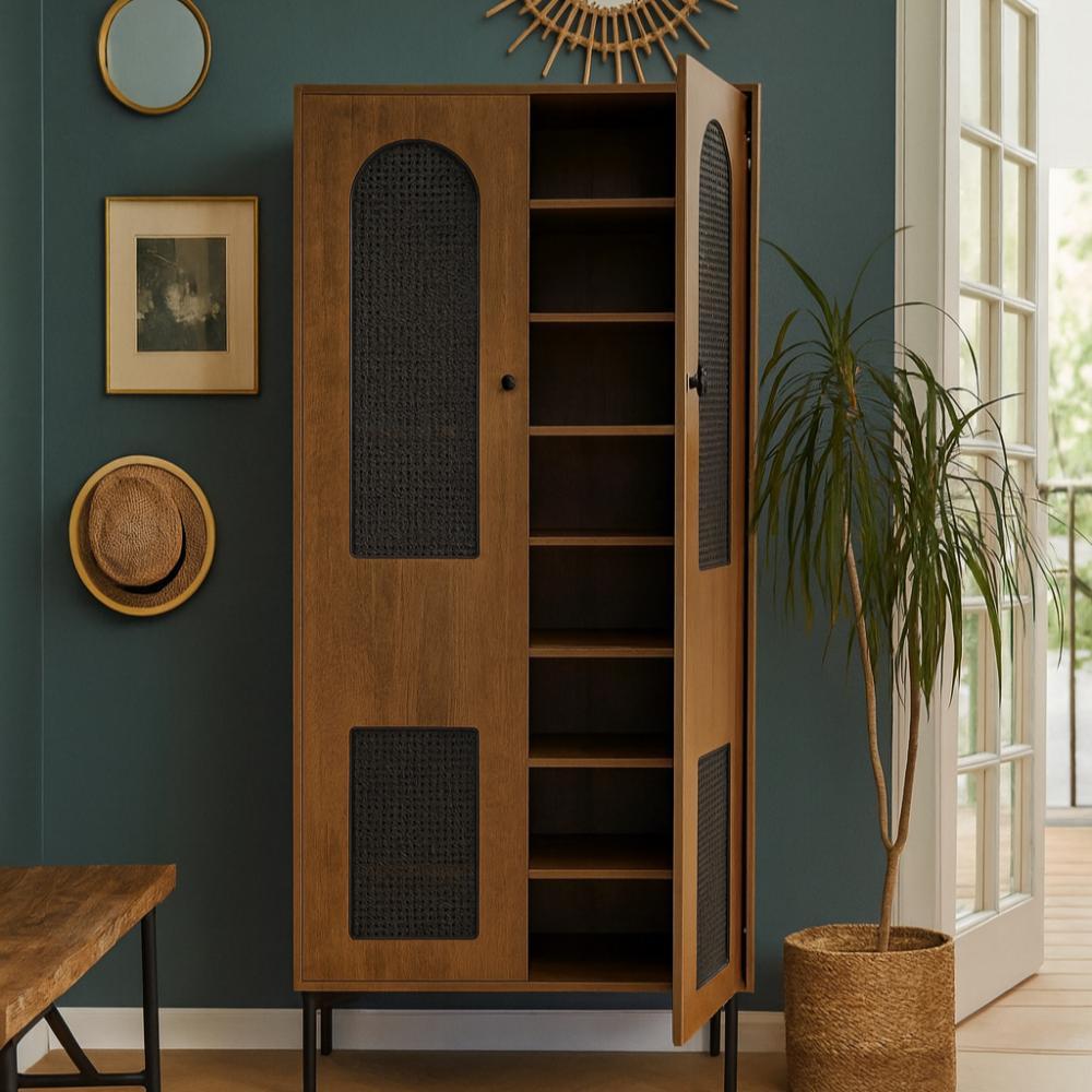 - تضيف لمسة الراتان على الأبواب طابعاً فاخراً يبرز الذوق الرفيع ويحول الدولاب إلى قطعة ديكور راقية تضفي لمسة من الفخامة على مدخل المنزل أو الغرفة.