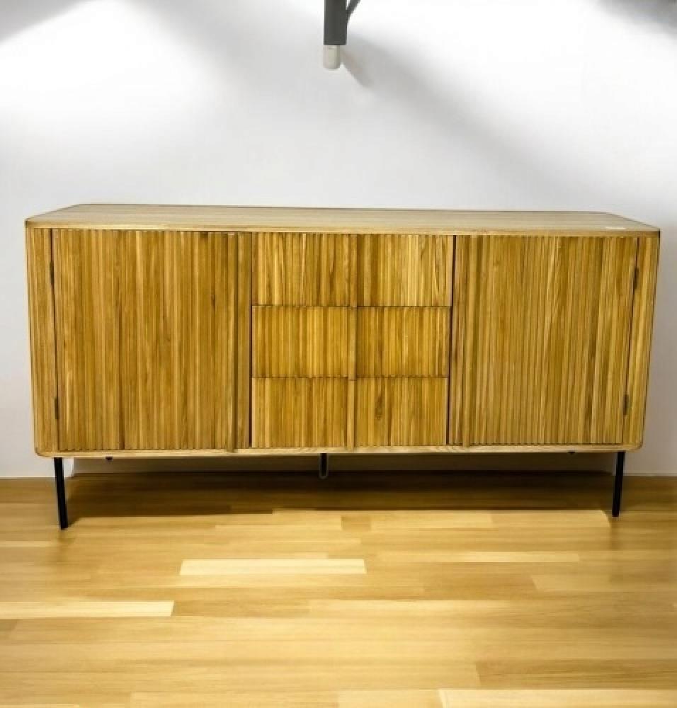بوفيه أو خزانة جانبية طويلة ومنخفضة بتصميم عصري من منتصف القرن. يتميز بإطار خشبي بلون دافئ وأربعة أبواب. تتميز الأبواب بتصميم فريد من ألواح الروطان أو القصب المنسوجة بلون طبيعي فاتح، مما يخلق مظهراً محكمًا ومتجدد الهواء. يرتفع الخزانة قليلاً عن الأرض بواسطة أرجل قصيرة مدببة، وهي سمة مميزة لتصميم منتصف القرن الحديث. تم تشطيبه بمقابض عمودية أنيقة باللون الذهبي أو النحاسي على كل باب.