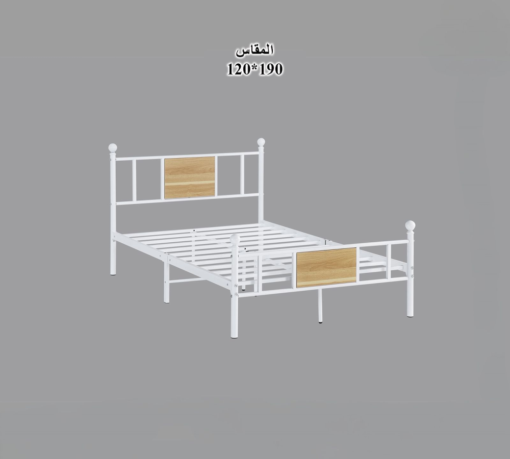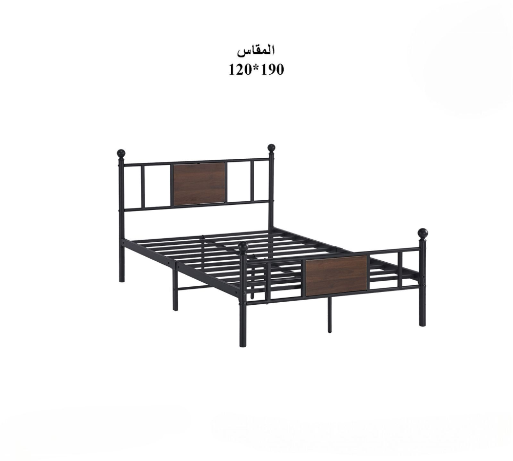 - المادة: هيكل معدني أسود قوي ومتين، يتضمن لوحين من الخشب (أو خامة شبيهة بالخشب) بلون بني داكن في كل من رأس ومقدمة السرير (Headboard & Footboard)، مما يمنحه مظهراً عصرياً وجذاباً.