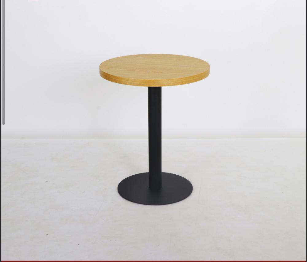 ترتكز الطاولة على قاعدة مركزية أنيقة مصنوعة من المعدن الأسود. هذا التصميم يمنحها ثباتاً جيداً ويضيف لمسة عصرية وتباين جذاب مع سطح الطاولة الخشبي. القاعدة دائرية ومسطحة، مما يساهم في استقرار الطاولة ويمنعها من الانقلاب.