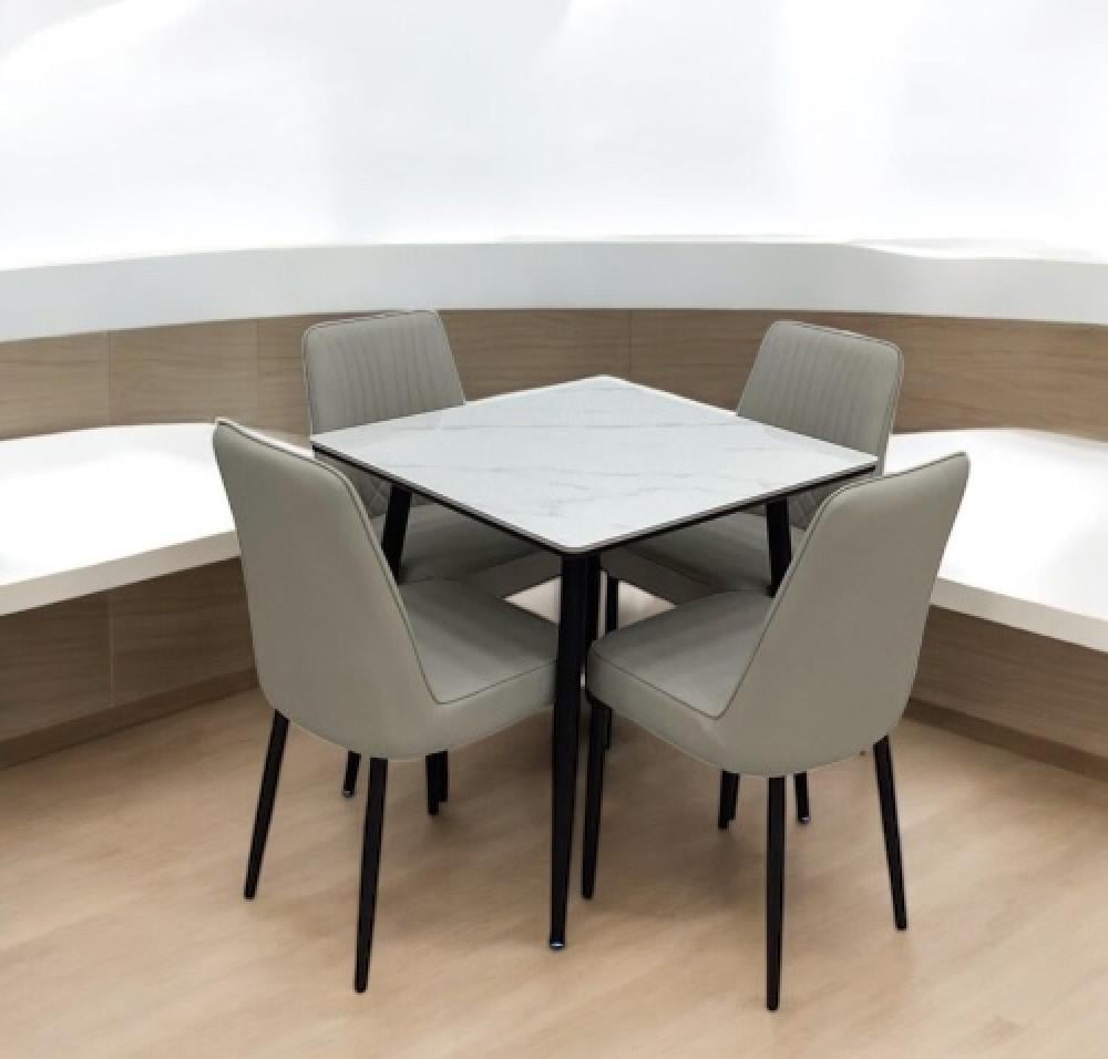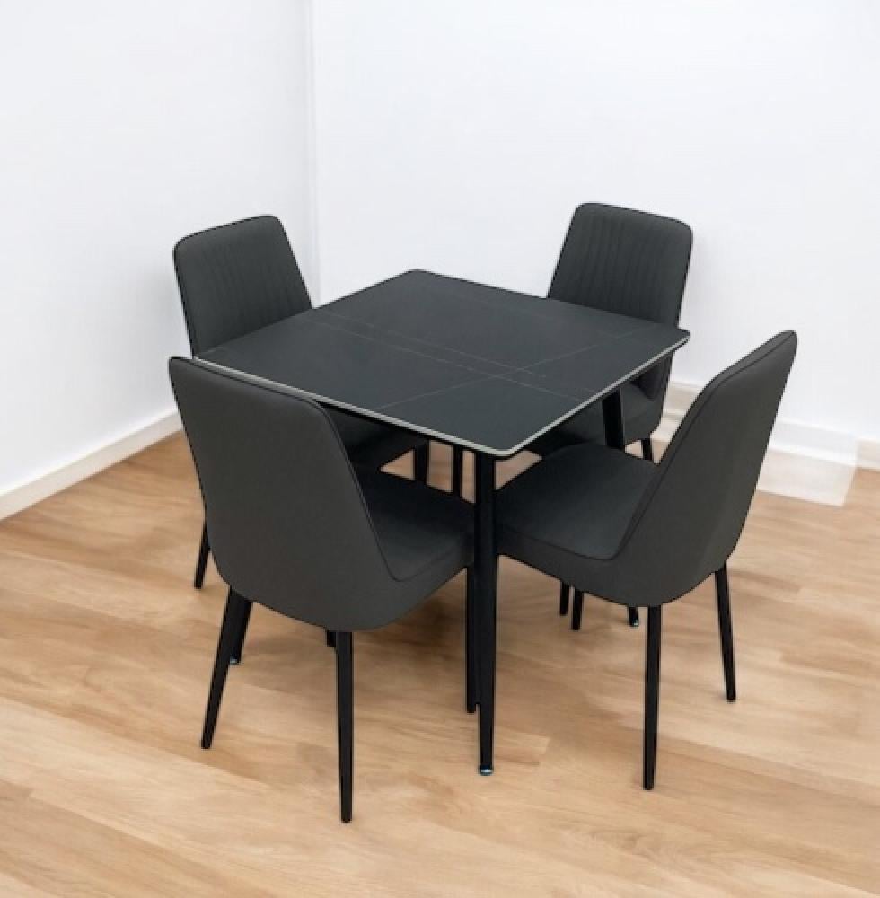 طقم طاولة طعام عصري وأنيق يتكون من طاولة بسطح مصنوع من السيراميك المتين وأربعة كراسي مريحة. يتميز التصميم بالبساطة والأناقة.