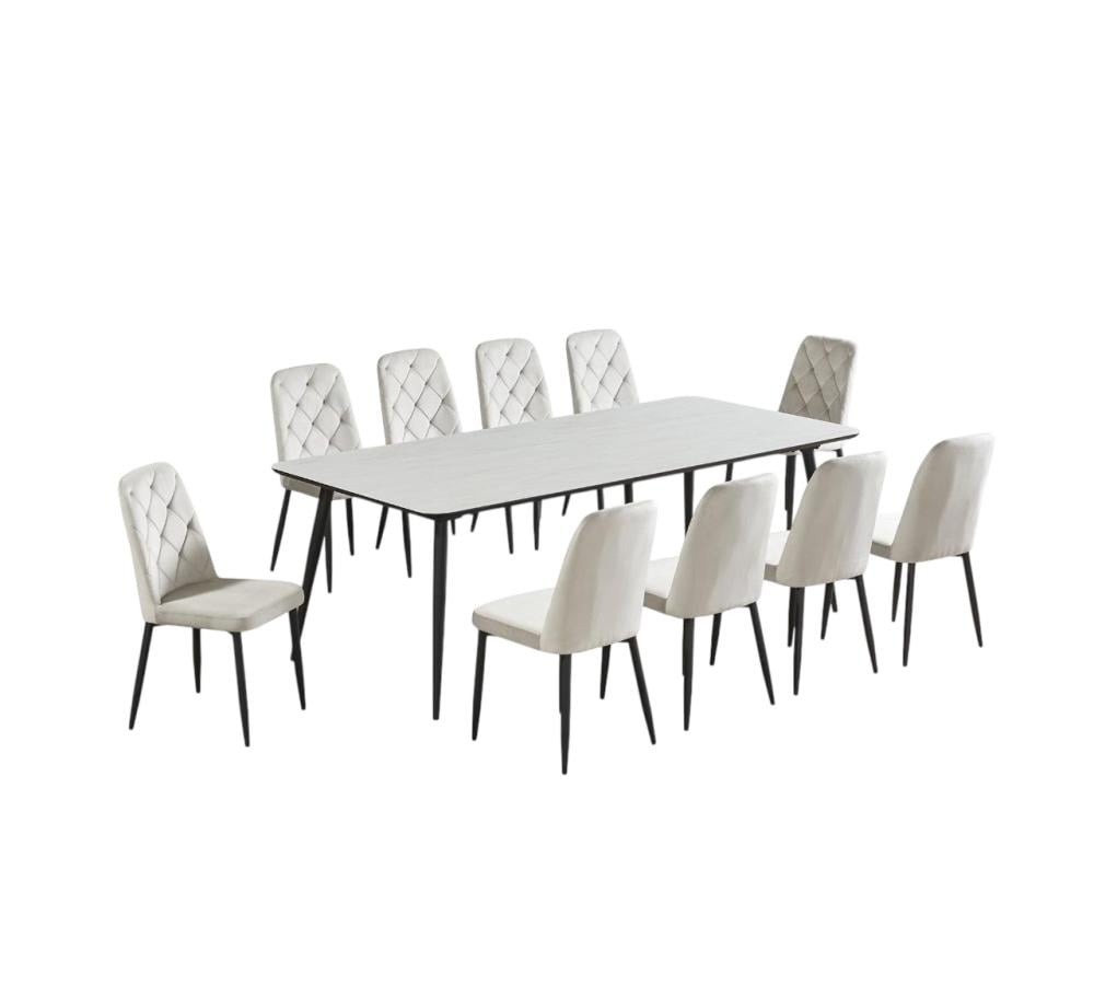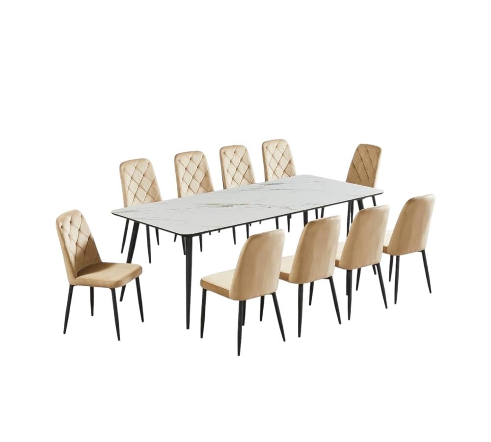 طقم طاولة الطعام الفاخر هذا يجمع بين التصميم العصري واللمسات الكلاسيكية الراقية، ليقدم تجربة تناول طعام أنيقة تتسع لعشرة أشخاص ضمن مساحة راقية ومتوازنة.