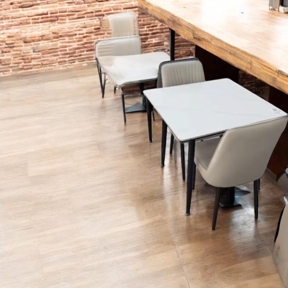 طقم طعام صغير الحجم مكون من ثلاث قطع ومناسب للمساحات الصغيرة. يتميز بسطح طاولة مربع مصنوع من مادة السيراميك متعدد الالوان مع تفاصيل خطية دقيقة. ترتكز الطاولة على أرجل معدنية سوداء رفيعة. يتضمن الطقم كرسيين متطابقين بمقاعد وظهور مبطنة بلون رمادي داكن أو فحمي مماثل. الكراسي أيضاً مزودة بأرجل معدنية سوداء.