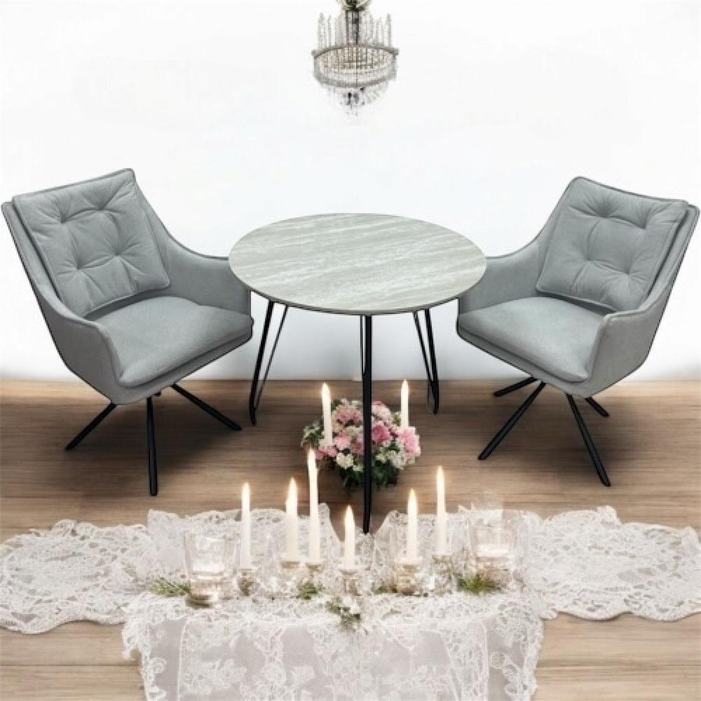 طاولة صغيرة للمقهى مكون من ثلاث قطع. يتضمن سطح طاولة دائريًا بلون فاتح، ربما يكون رخامًا أو تشطيبًا مشابهًا، مدعومًا بقاعدة معدنية سوداء أنيقة ذات ساق مركزية وأربعة أرجل منحنية بلطف. يكمل الطقم كرسيان أنيقان بمقاعد وظهور مبطنة باللون الفاتح، ويتميزان بتصميم قناة عمودية دقيقة. يتميز الكرسيان بإطارات معدنية سوداء رفيعة وأرجل مائلة قليلاً.