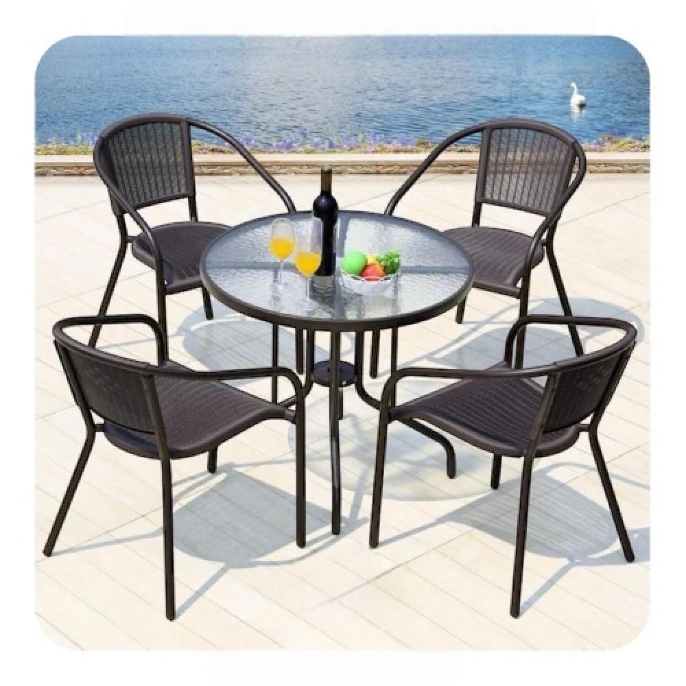 طقم طاولة طعام خارجي أنيق وعصري يتكون من طاولة دائرية وأربعة كراسي مريحة. يبدو التصميم مناسبًا للاستخدام في الحدائق، الشرفات، أو الفناء.