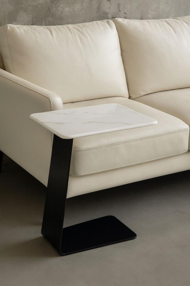 • سطح سيراميك أبيض أنيق وسهل التنظيف يعكس الفخامة والبساطة، يوفر مساحة عملية لوضع الأغراض بأمان ويمنح الطاولة مظهرًا ناعمًا ومتناسقًا مع الديكور.