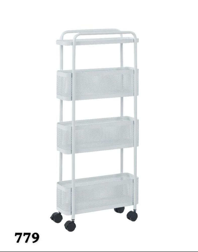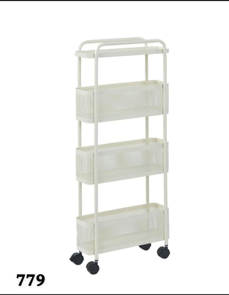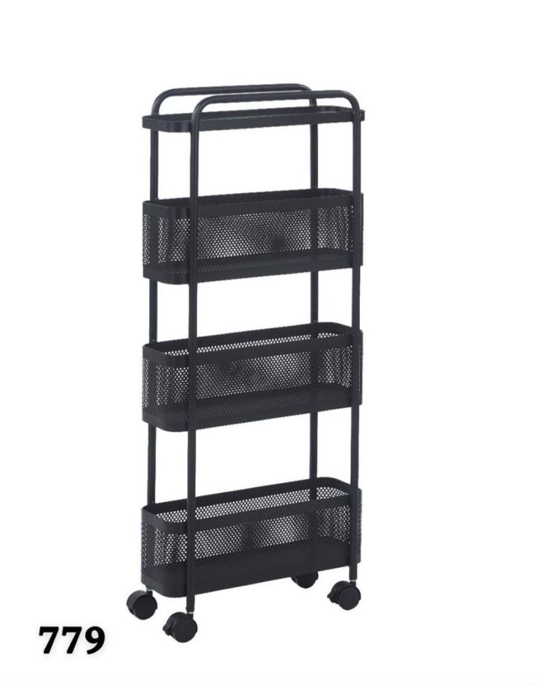 عربة تخزين سوداء رفيعة ذات 4 طبقات وشبكة معدنية، مزودة بعجلات لسهولة التنقل