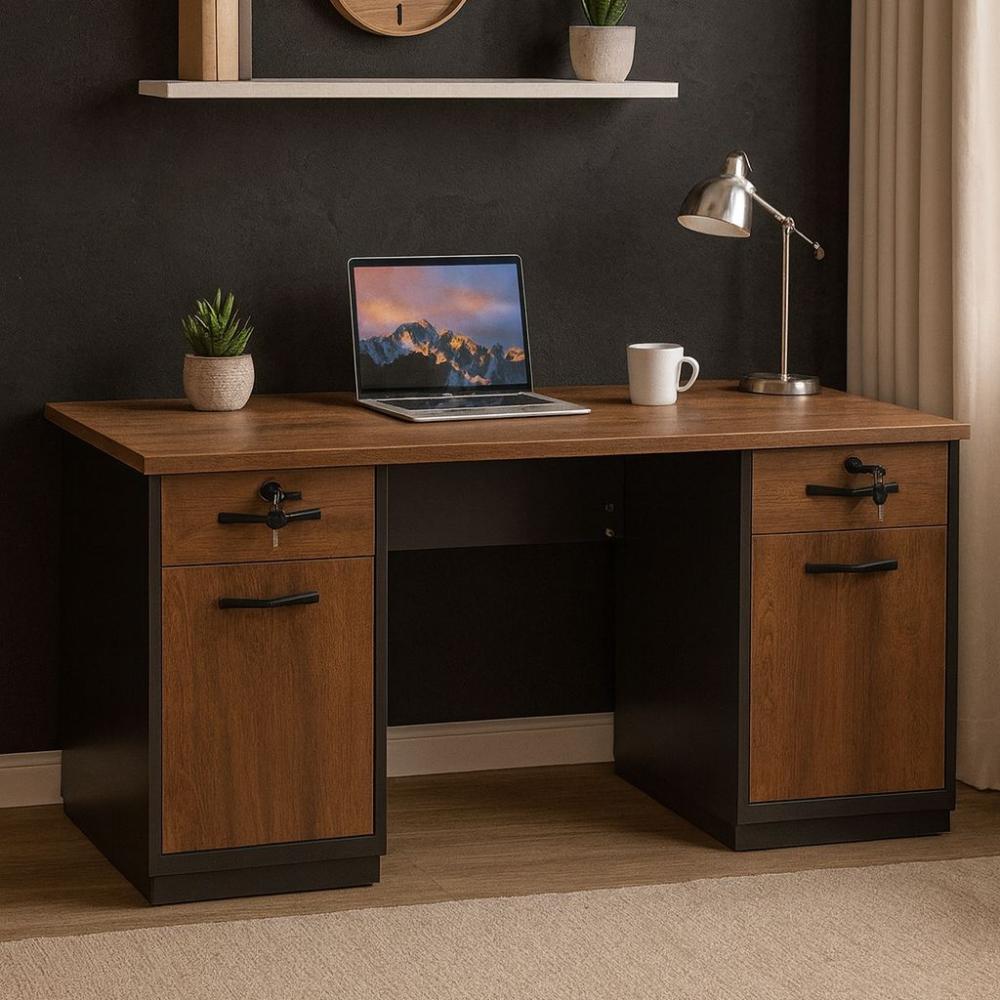 يتميز المكتب بتصميمه العملي مع أدراج واسعة مزودة بمقابض معدنية أنيقة لتخزين الملفات والأدوات، بالإضافة إلى درج علوي بقفل للحفاظ على خصوصيتك وأمان متعلقاتك.