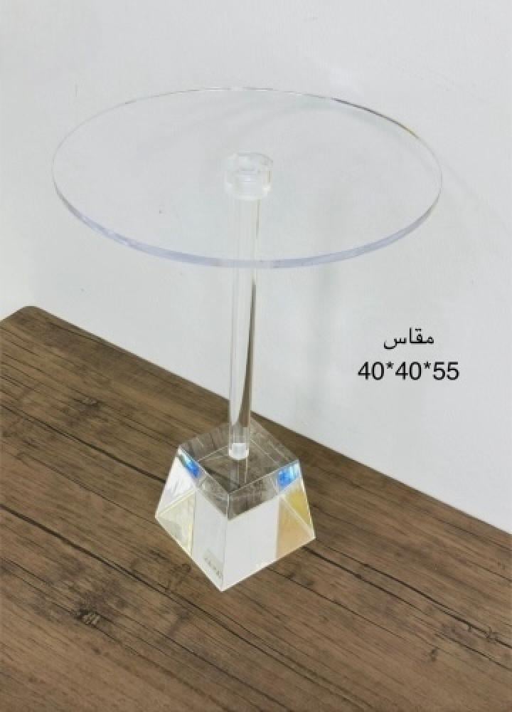 طاولة دائرية مصنوعة من الأكريليك الشفاف. يتميز بسطح علوي دائري، ودعامة مركزية أسطوانية نحيفة، وقاعدة دائرية ثابتة. تسمح المادة الشفافة بأن يكون العنصر المعروض هو النقطة المحورية. الأبعاد الموضحة هي 40 سم (طول) × 40 سم (عرض) × 55 سم (ارتفاع)، مما يشير إلى أنه حامل مرتفع نسبيًا.