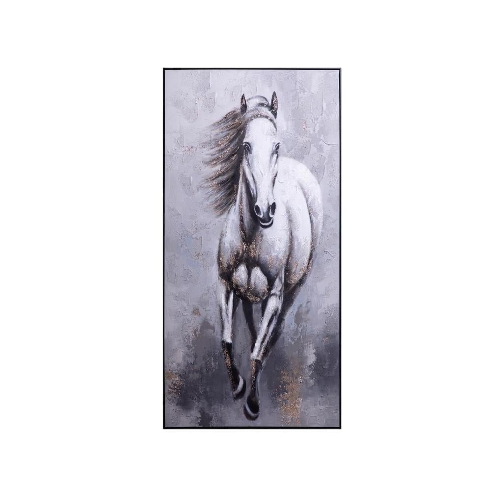 لوحة جدارية عمودية تجريدية تصور حصانًا رشيقًا في وضع الحركة، بألوان رمادية وبنية مع خلفية بضربات فرشاة ذهبية سائلة. الأبعاد 180 سم (ارتفاع) × 100 سم (عرض).