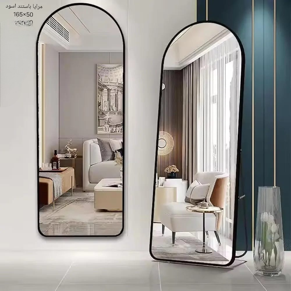 - التصميم: مرآة أرضية (ستاند) يمكن وضعها بشكل حر دون الحاجة إلى تعليقها على الحائط. غالبًا ما تأتي مع مسند خلفي قابل للطي لتثبيتها بزاوية مائلة.