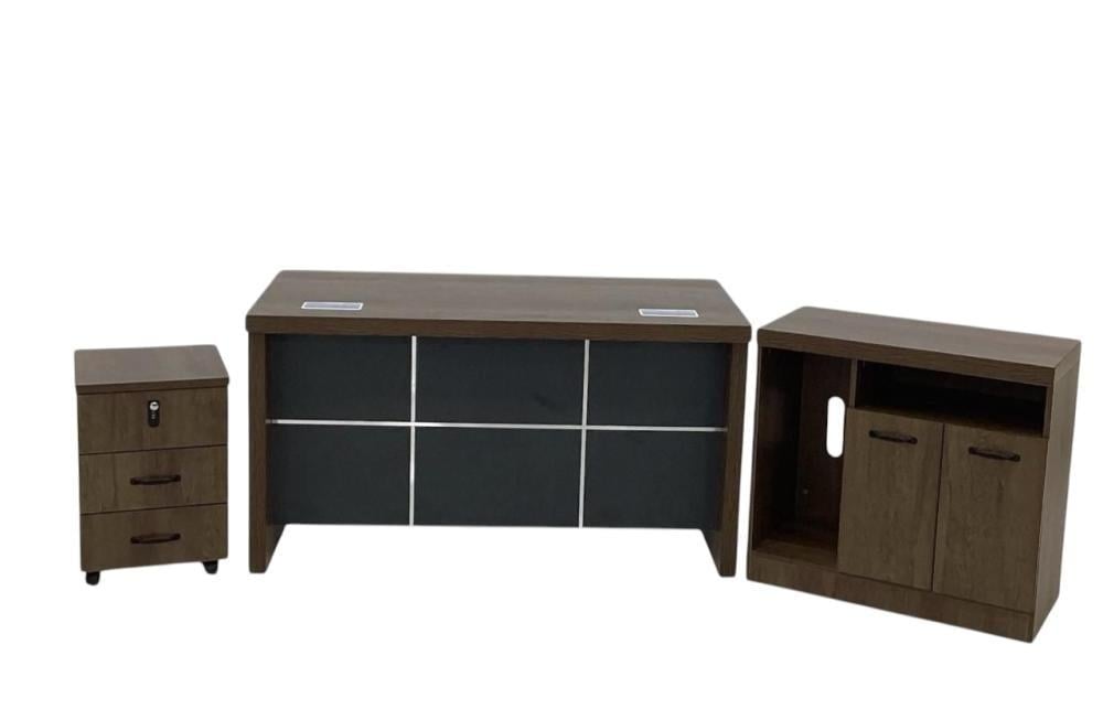 - لون بني داكن وأسود: مزيج من اللون البني الداكن لسطح الطاولة ووحدات التخزين، مع لمسات من الأسود في الفواصل بين الأدراج.